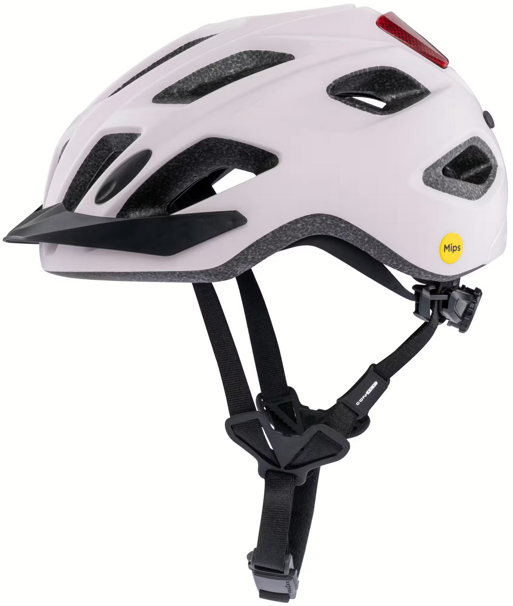 CONTEC "Abbey MIPS"-hjelmen, der er opkaldt efter den verdensberømte Abbey Road i London, er et bevis på, at sikkerhed kan gå hånd i hånd med stil. Med Abbey MIPS kan du være sikker på, at du er godt kørende.Byhjelmen med visir af genanvendt marineplast er lavet af en kombination af en let in-mould micro-shell plastkonstruktion med en tynd EPS inderskal og er også udstyret med MIPS-systemet. Hvad er MIPS? MIPS-teknologien gør det muligt for hjelmskallen at bevæge sig i forhold til hovedet i tilfælde af et vinklet sammenstød. Det beskytter din hjerne mod rotationskræfter og alvorlige skader.Der er et LED-lygte bag på hjelmen, som gør dig mere synlig for andre trafikanter i skumringen. Det integrerede lys kan genoplades via en USB-port. Den maksimale lysvarighed er 165 minutter. En anden funktion til øget synlighed er de reflekterende stropper på Abbey MIPS. Disse er lavet af genbrugte Flasker!Med det magnetiske Fidlock snaplås inklusive polstring kan hjelmen også åbnes og lukkes med én hånd uden risiko for at komme i klemme. Den integrerede TriVider, en ekstra bred stropdeler, sikrer et højt niveau af komfort og tilpasning. Apropos tilpasning: Takket være XY-sizeren (justeringshjulet) bag på hjelmen kan Abbey MIPS justeres individuelt i højden og bredden. Den kølende polstring inde i hjelmen har en svedhæmmende effekt og kan vaskes og udskiftes.Abbey MIPS fås i to forskellige størrelser og tre farvevarianter. Hver af modellerne er malet med miljøvenlige, vandbaserede farver.